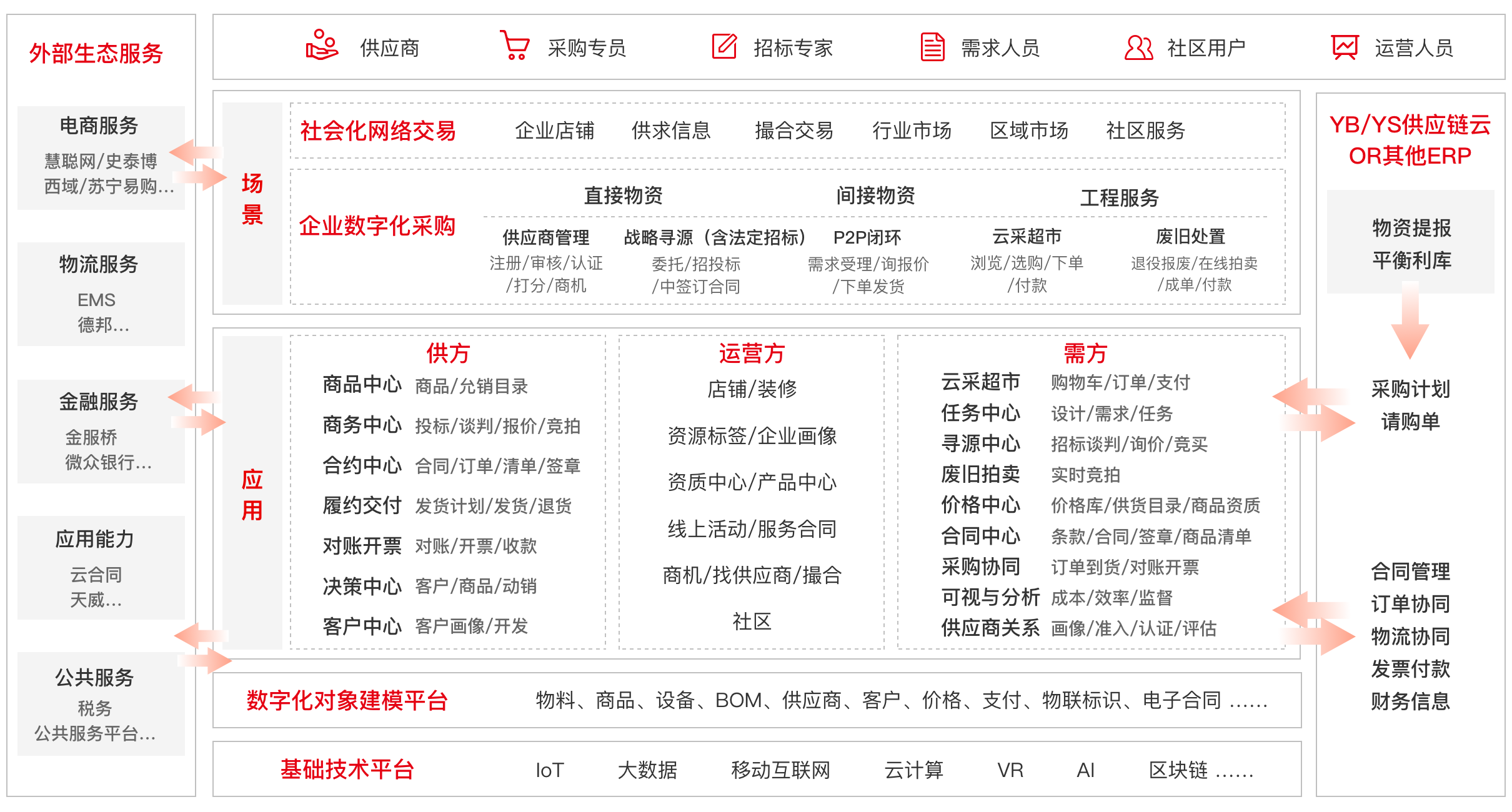 社會化網(wǎng)絡(luò)交易平臺:以連接、協(xié)同、共享、創(chuàng)新為核心理念,立足需方構(gòu)建涵蓋采購尋源(招標(biāo)/談判/詢價)、合同中心、采購協(xié)同、云采超市、廢舊拍賣、可視與分析、供應(yīng)商關(guān)系管理的社會化網(wǎng)絡(luò)交易平臺
